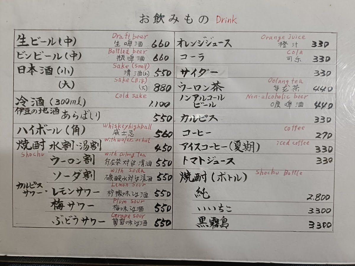 The restaurant also offers refreshing drinks to complement the meal, including the popular 生ビール (Draft Beer) and various types of 焼酎 (Shochu), ideal for those who want to pair their meal with a traditional Japanese spirit. If you enjoy sushi-style dishes, the あじタタキ定食 (Tataki Mackerel Set) presents a lightly seared fish dish, offering a unique texture and flavor.