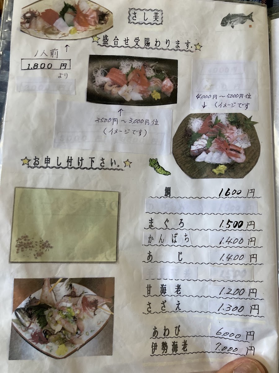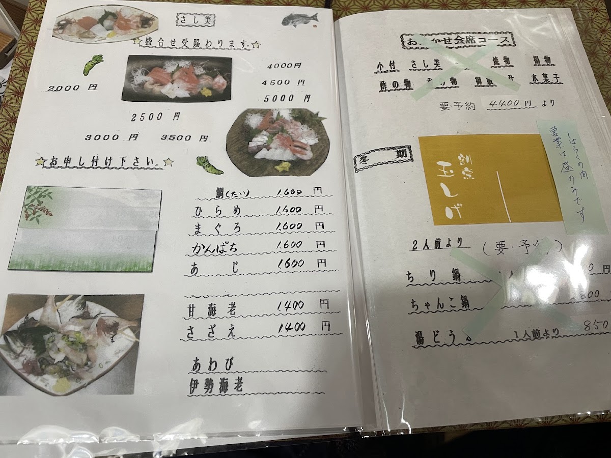 Lastly, the 刺身の盛り合わせ (Sashimi Platter) presents an assortment of raw fish, ideal for sashimi aficionados looking to enjoy a variety of flavors. Whether you're in the mood for something crispy, savory, or light, Tamashige Izu's menu is packed with options that will satisfy every palate, offering an authentic taste of Japan's coastal cuisine.